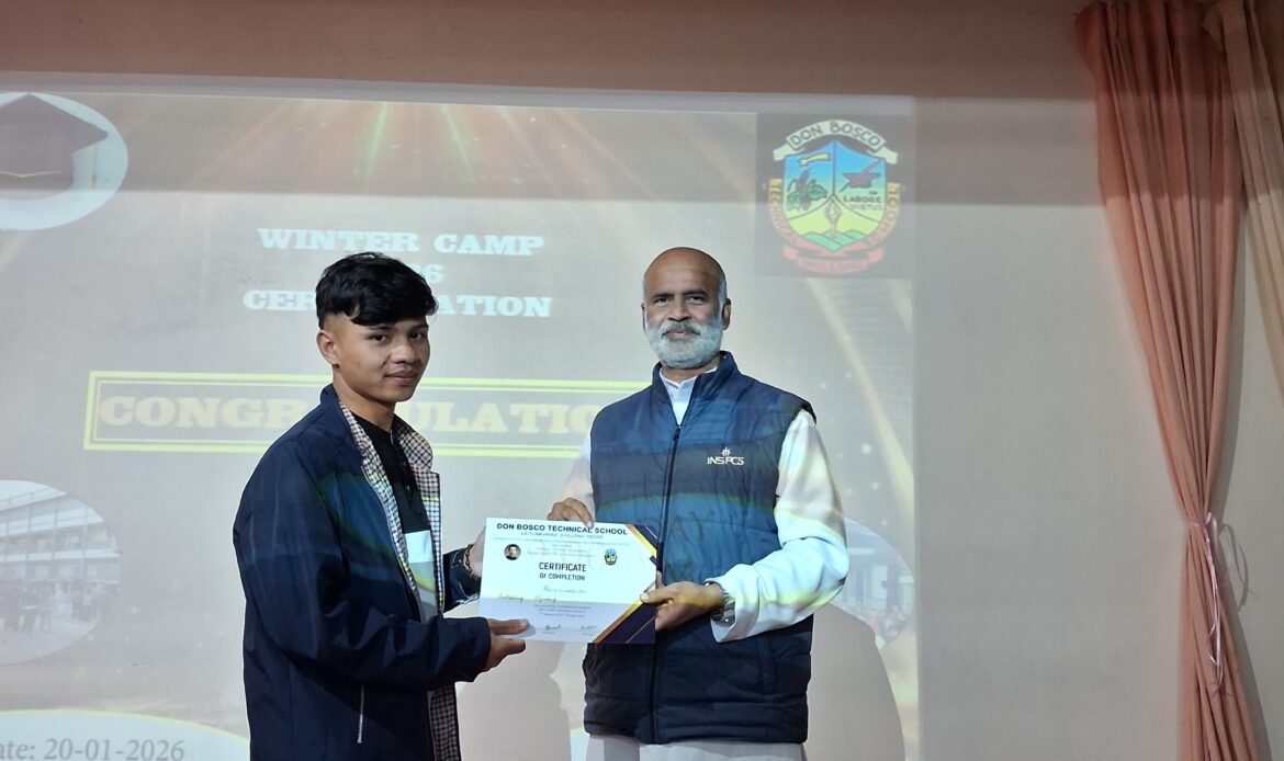 Shillong, 20th January 2026: The Winter Camp 2026 at Don Bosco Technical School (DBTS), Shillong, concluded meaningfully with the Concluding Ceremony and Certification Programme held on 20th January 2026 at 9:00 AM. The programme began with a prayer and Bible reading led by Brother Donbok, followed by a welcome address from Fr Shiningstar Dkhar, Principal of DBTS, who appreciated the discipline, commitment, and enthusiasm of the trainees. A song presented by the brothers added joy to the occasion. The highlight of the ceremony was the inspiring message delivered by Fr Saji Stephen, Rector of the DBTS Community, who encouraged the trainees to remain focused, value-driven, and responsible in their future endeavors. The event concluded with the distribution of Certificates of Completion, marking the successful end of the Winter Camp 2026.